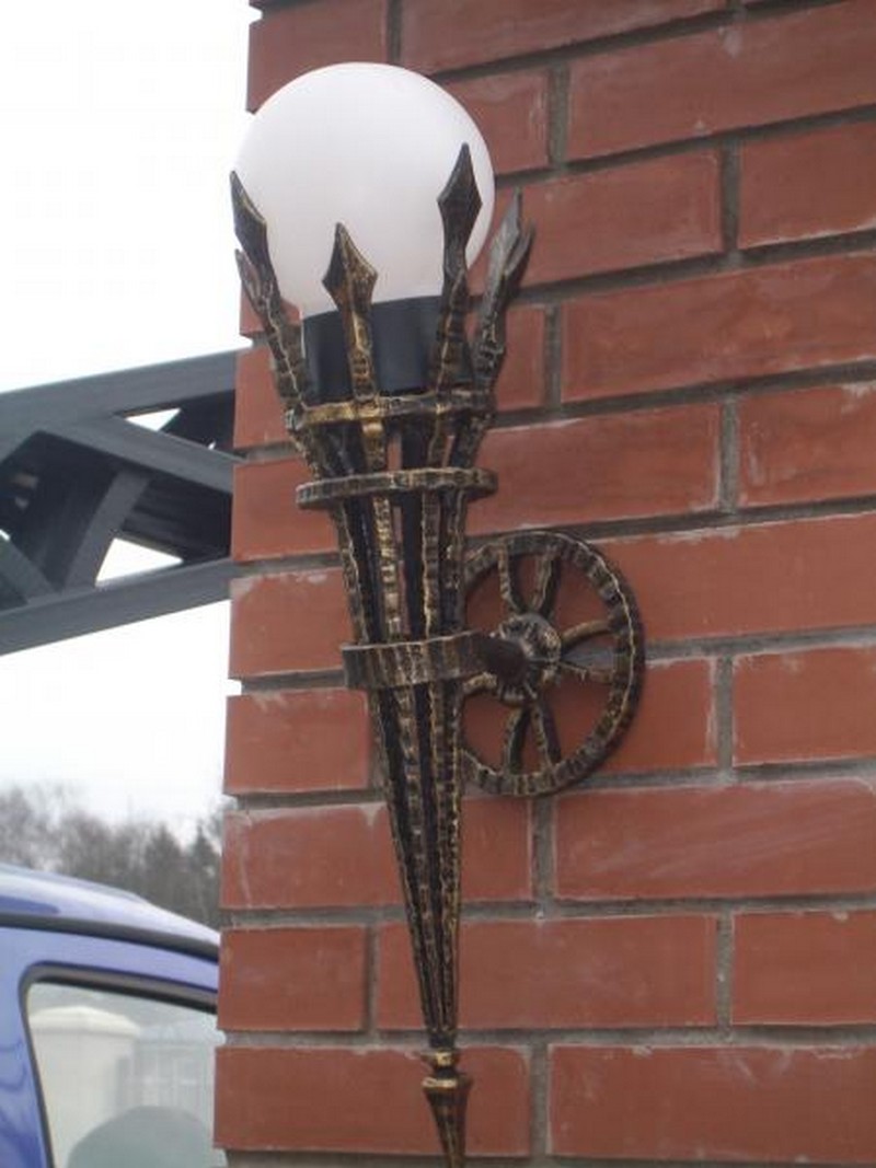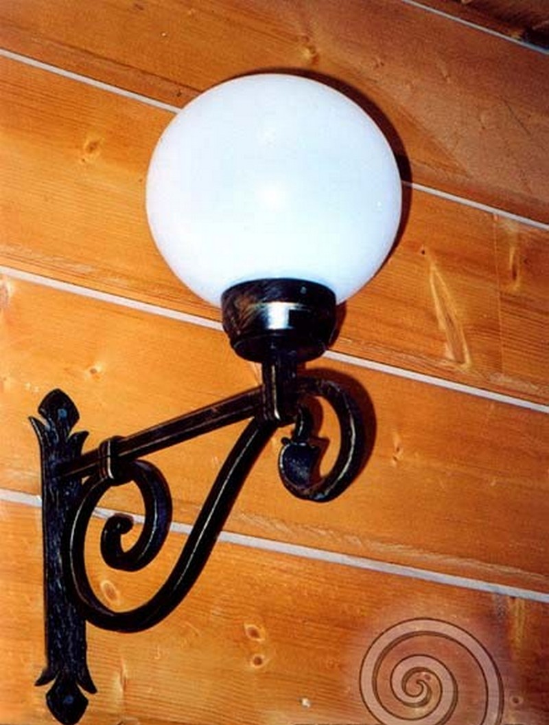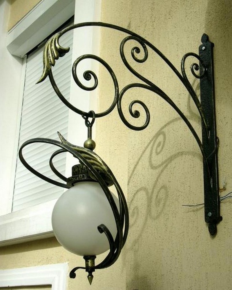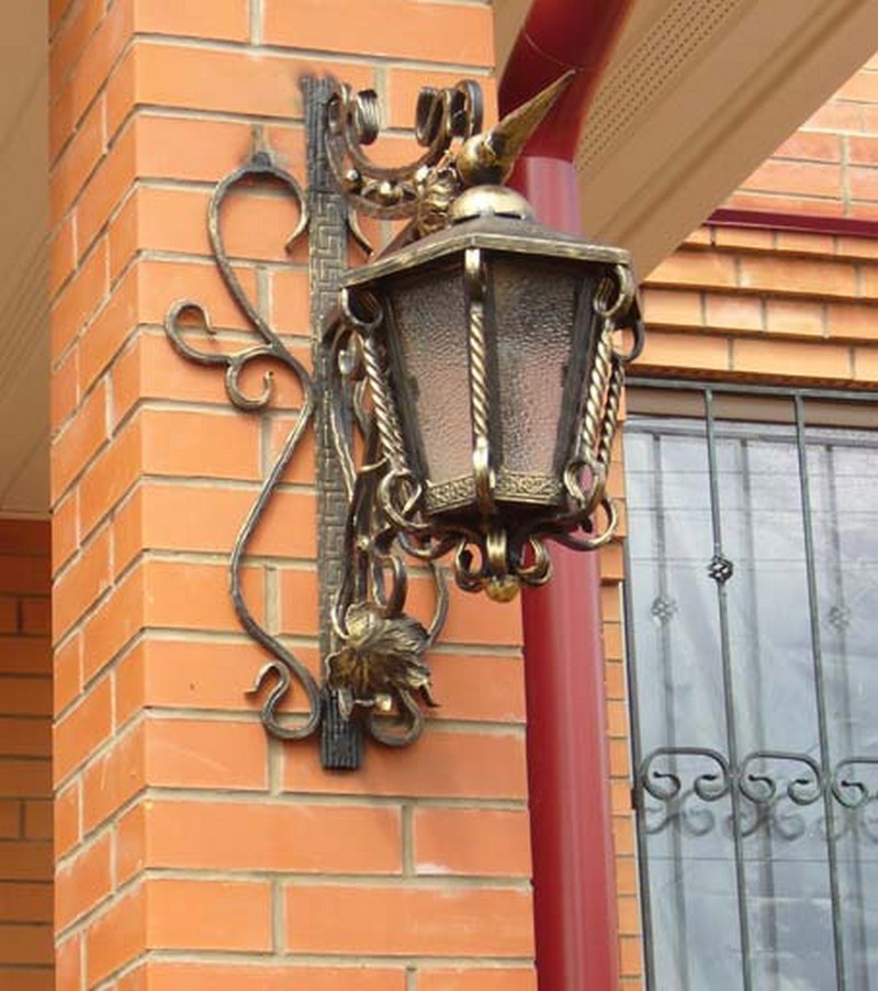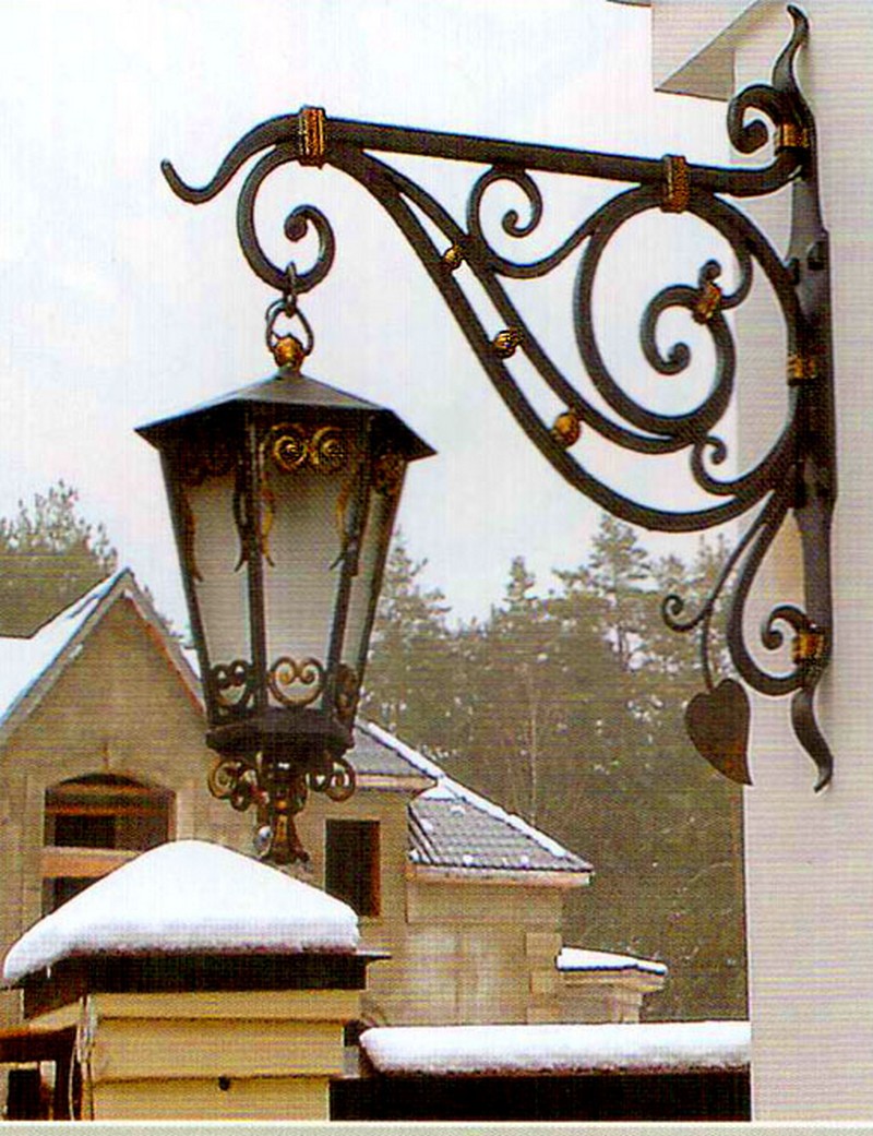 Уличные светильники могут располагаться как возле дома, так и рядом с входной дверью, на заборе, у ворот, на стене и в других, порой самых неожиданных местах. Они не только будут освещать территорию, но и создадут неповторимую атмосферу прямо у вашего дома. Немаловажно правильно подобрать дизайн, ведь кованые светильники и фонари хорошо видны не только ночью, но и днем, внося, тем самым, свой вклад в общий вид вашего участка. К сожалению, об освещении часто забывают и часто рядом с красивыми домами с коваными забором, калиткой, воротами и великолепным кованым козырьком можно наблюдать банальный прожектор. Попробуйте соблюсти стилистику, поставьте кованые фонари по участку и у входа и вы увидите, как преобразиться все пространство. В любом случае, размеры фонарей, их дизайн и стиль ограничены только условиями эксплуатацией и вашей фантазией.